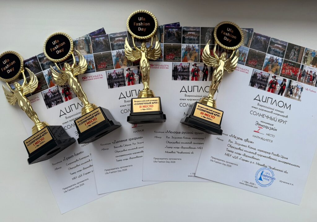 Поздравляем образцовый коллектив самодеятельного художественного творчества Театр моды «Вдохновение» с заслуженными наградами (рук-ль Зозуленко К.В., хореограф Рогова И.Д.)Коллектив принял участие с четырьмя коллекциями во Всероссийском конкурсе юных художников-модельеров в городе Уфа и занял все призовые места
