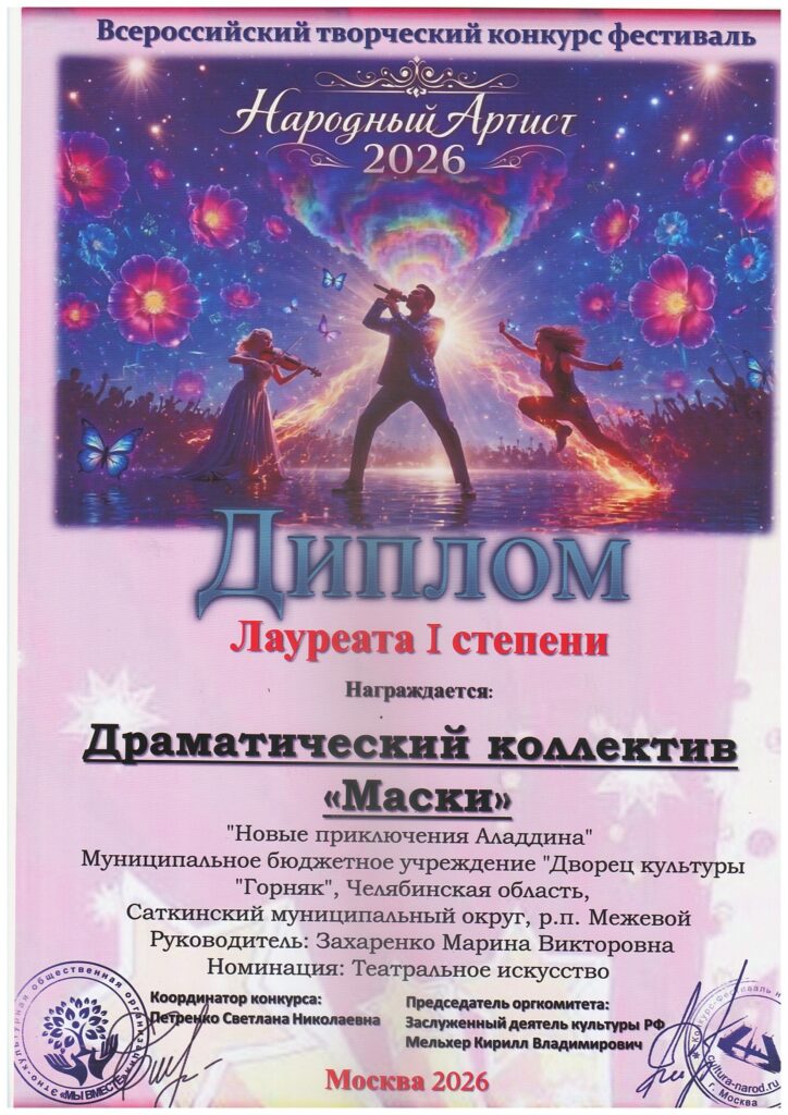 Поздравляем драматический коллектив «Маски» (руководитель М.В. Захаренко) — с Победой на Всероссийском творческом конкурсе- фестивале «НАРОДНЫЙ АРТИСТ»