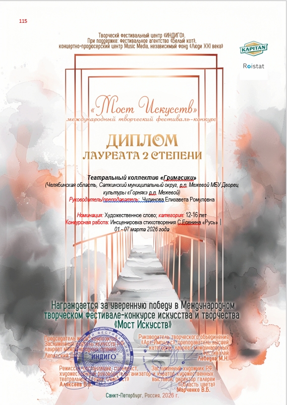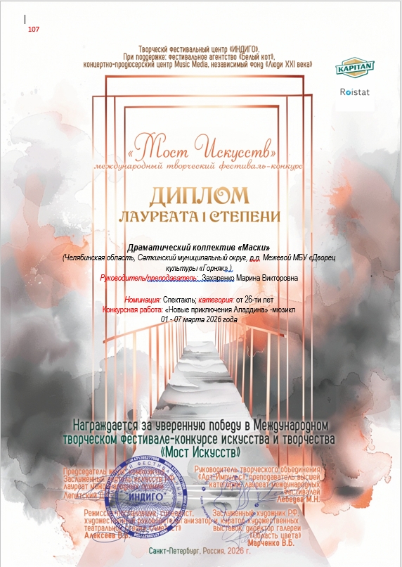 Поздравляем детско- юношеский театральный коллектив «Гримасики» -руководитель Чудинова Елизавета Ромуловна и взрослый театральный коллектив «Маски» — руководитель Захаренко Марина Викторовна, с уверенной победой на Международном творческом фестивале — конкурсе искусства и творчества -«МОСТ ИСКУССТВ». г. Санкт-Петербург.